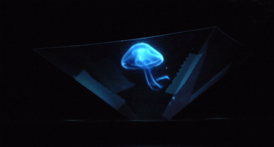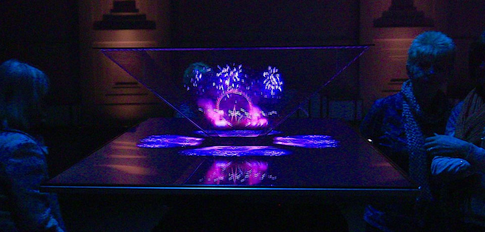 又稱“幻影成像” ,利用45度光學(xué)反射原理實(shí)現(xiàn)的懸空幻想效果,幻影成像系統(tǒng)是基于“實(shí)景造型”和“幻影”的光學(xué)成像結(jié)合,將所拍攝的影像(人、物)投射到布景箱中的主體模型景觀中,演示故事的發(fā)展過(guò)程。