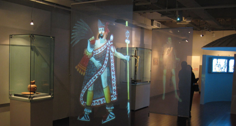 又稱“虛擬迎賓”。是指通過(guò)拍攝真實(shí)講解員結(jié)合三維后期技術(shù)制作出來(lái)的虛擬講解員,通過(guò)投影投射在人物形狀的玻璃上進(jìn)行講解。