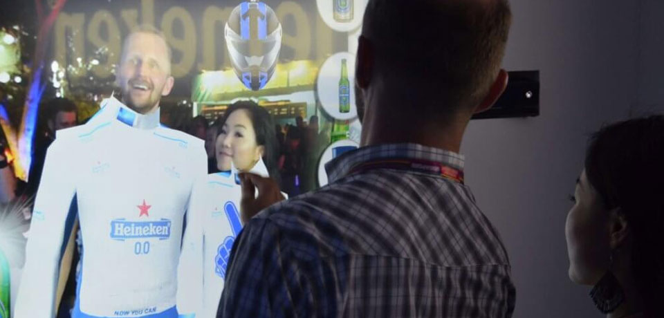拍照者走進拍照區(qū)域內,系統(tǒng)通過攝像頭捕捉人的肢體語言,此時,拍照者會看見自己的影像已經被合成到前方的屏幕里。